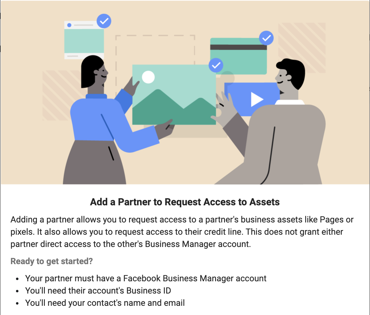 A “partner” is simply a third-party that you wish to share your digital assets with. Your digital assets through Business Manager include your Page, Instagram account, catalogs, pixels, ad accounts, and anything else you wish to share with a third-party. To get started you will need to know the business ID of the account you wish to share your assets with. For example, Media Pulse’s ID is 127528695684594. So, how do you find out your ID or a partner’s ID? Your partner should be able to tell you their ID, or they can request access to your account if you provide your ID to your partner. Facebook Business Help Center, shows three easy steps to get your business ID (NOT your page ID).