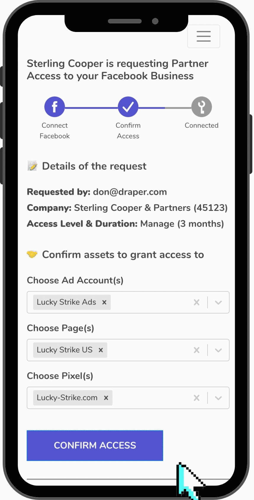 Once you or your partner send a request, you will confirm the assets you wish to give access to. Most of our friends at Media Pulse have no experience with sharing assets, have shared assets incorrectly, or were burned by an agency. (We’re here to put out those fires and heal your business.)